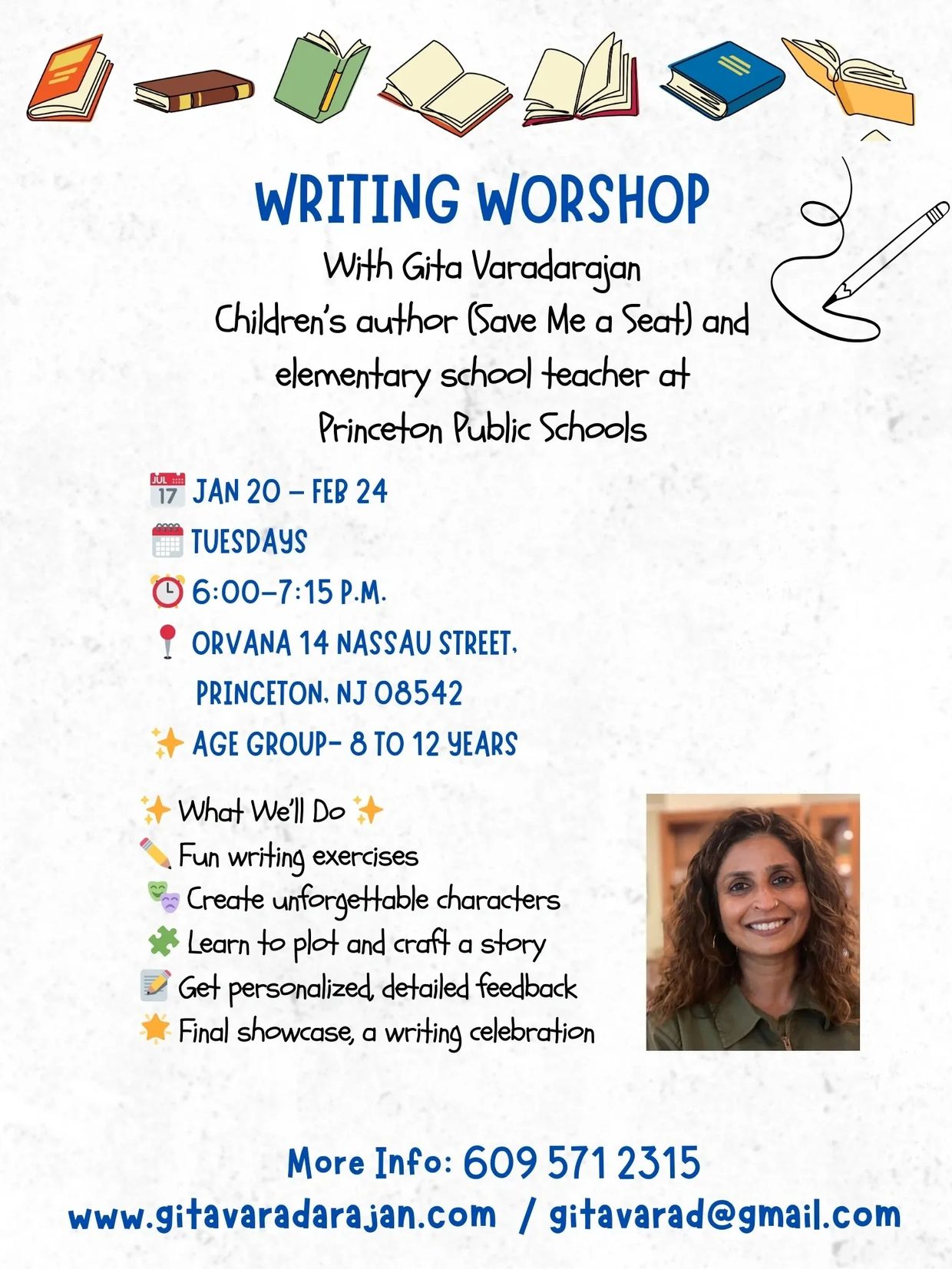 PLEASE LEAVE A MESSAGE IF YOU WOULD LIKE MORE DETAILS. ALSO, IF YOU DO NOT LIVE IN NJ AND ARE INTERESTED IN A WRITING WORKSHOP, LET ME KNOW.